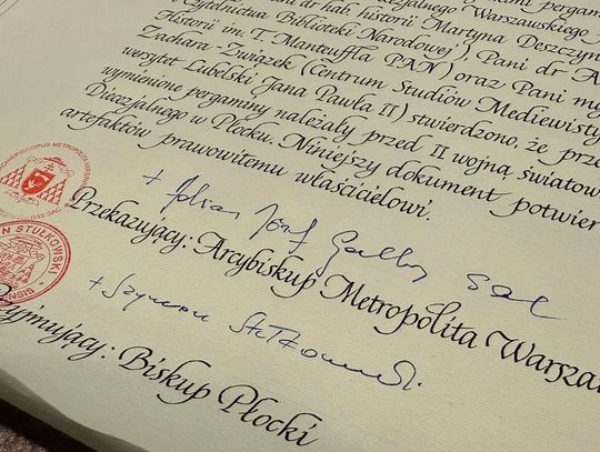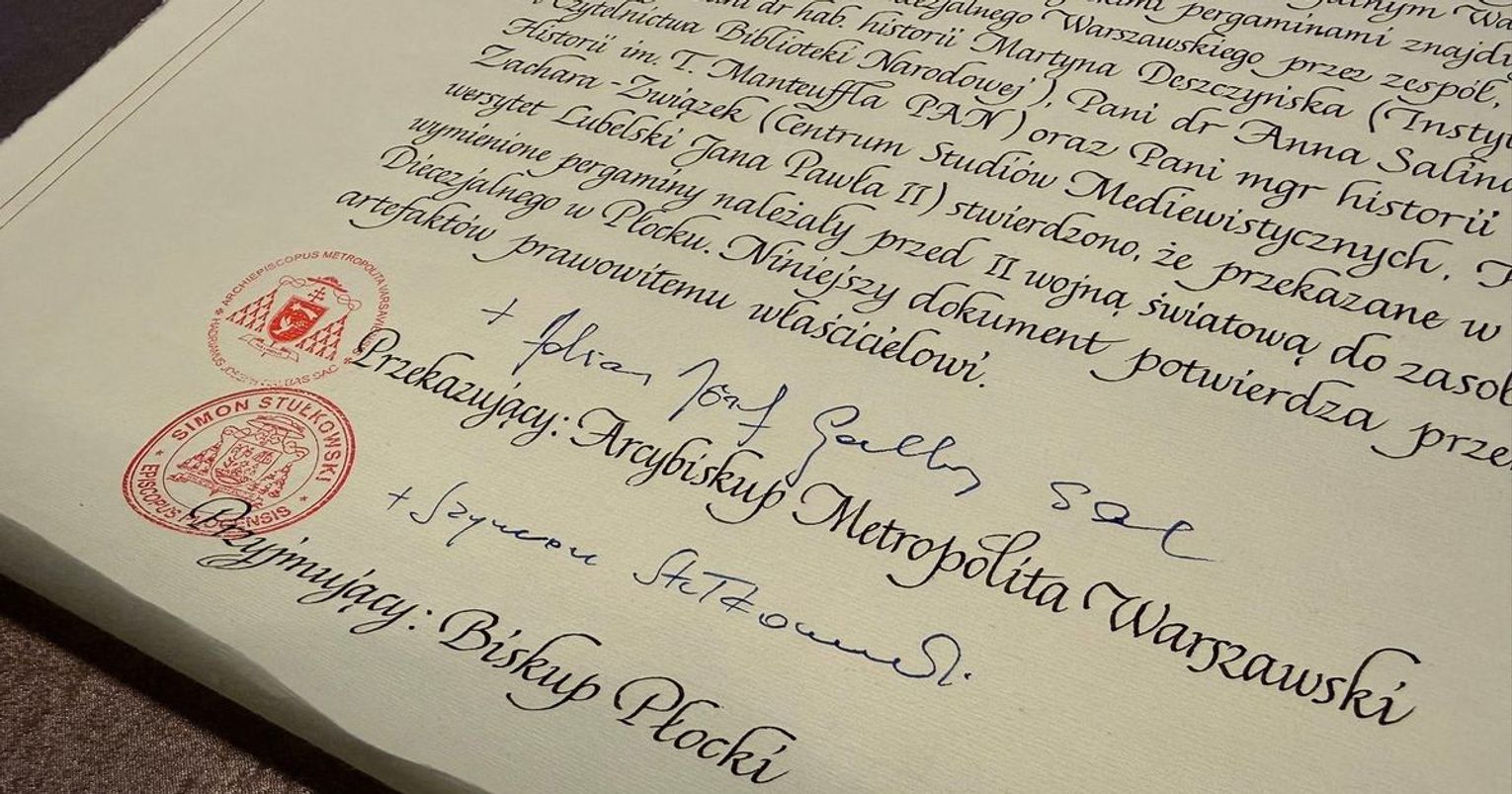 Dwa cenne świadectwa naszej historii, zapisane na pergaminie w XIII i XIV wieku, wróciły tam, gdzie jest ich miejsce. Źródła lokalnej historii, które przez kilka dziesięcioleci znajdowały się poza Płockiem, stały się ponownie częścią płockiego archiwum. Do Płocka zostały przekazane przez dotychczasowego depozytariusza, metropolitę warszawskiego abp. Adriana Galbasa.