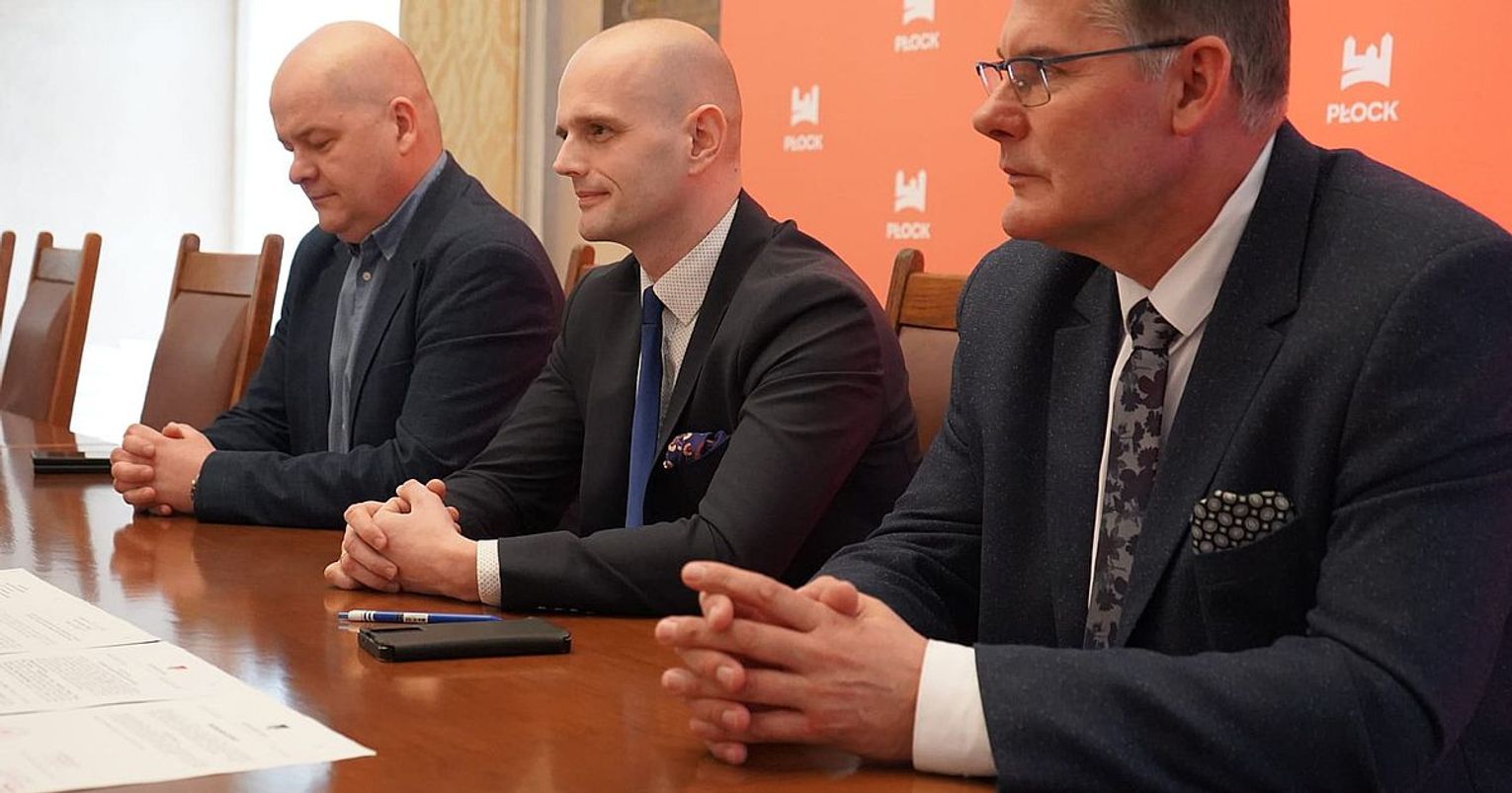 Starosta Sylwester Ziemkiewicz i jego zastępca Waldemar Zawadzki oraz prezydent Płocka Andrzej Nowakowski podpisali akt notarialny, w myśl którego prezydent przekazał w formie darowizny działkę, której powiat płocki jest użytkownikiem wieczystym.