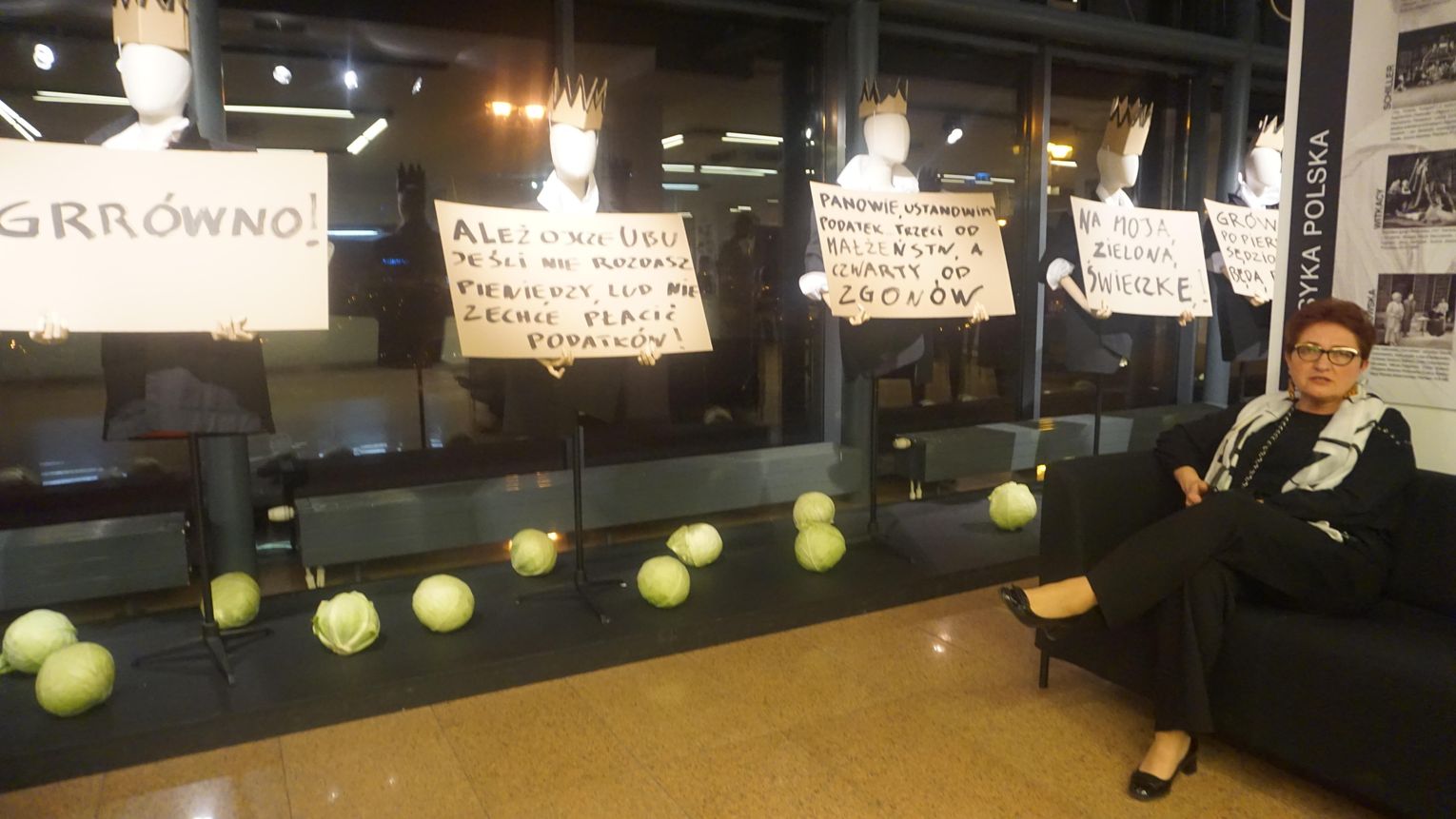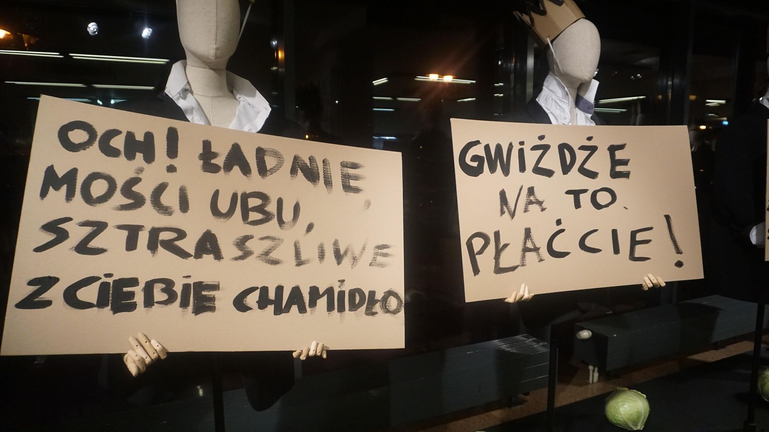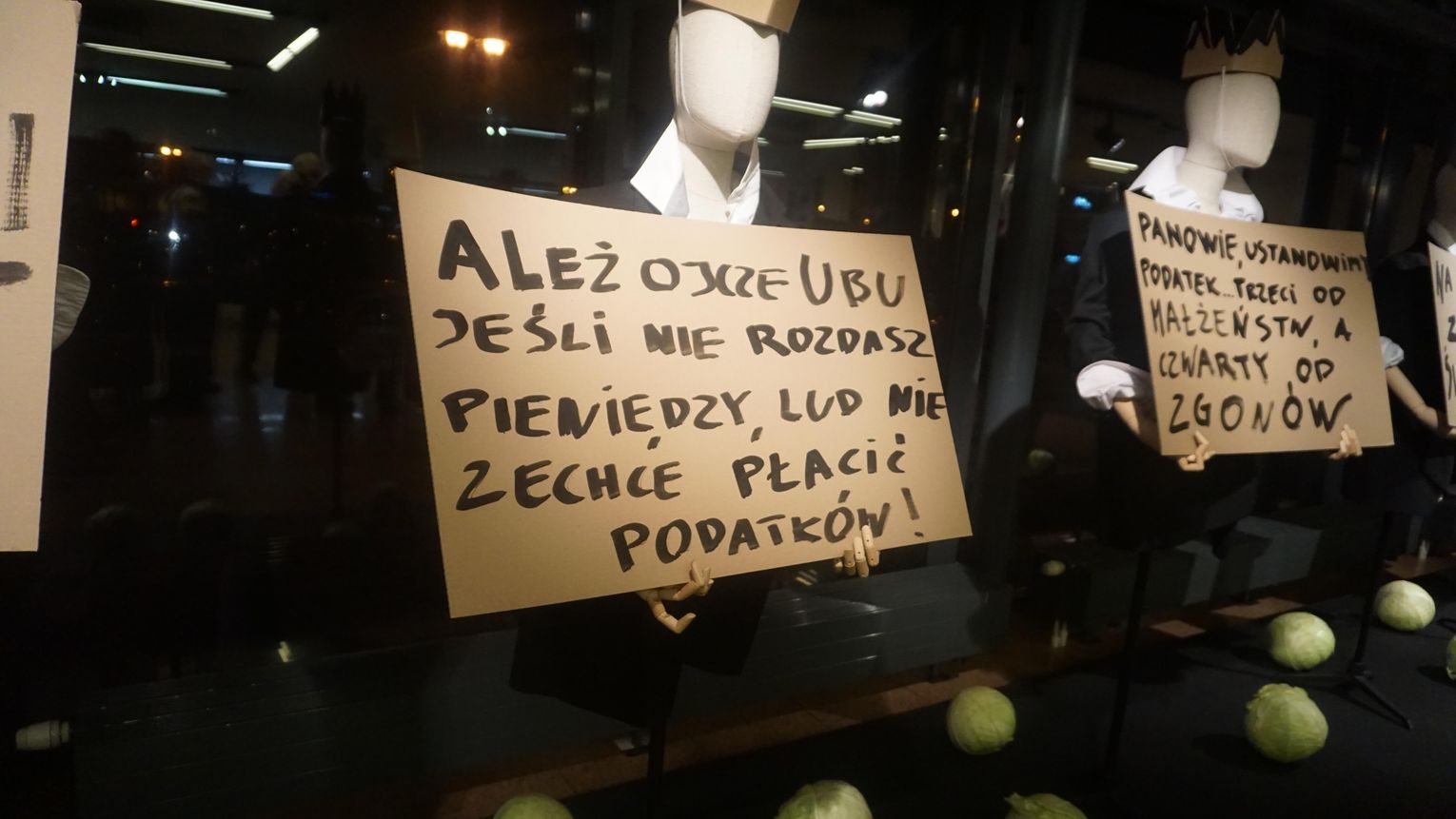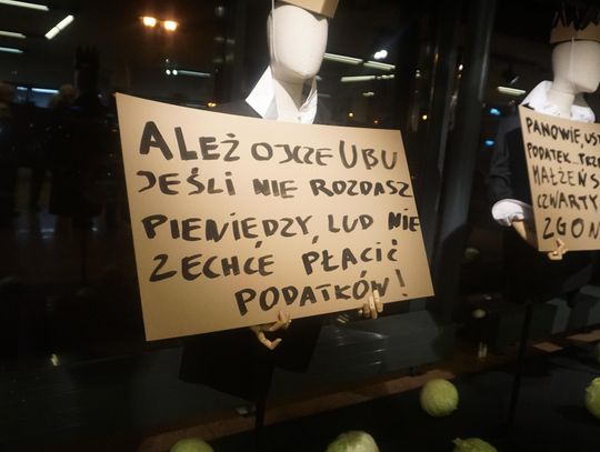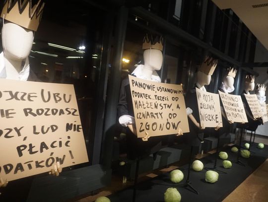 Opowieść o brutalnej ludzkiej zachłanności przesycona jest gorzką ironią. Para głównych postaci dramatu czyli Ubu i Ubica za wszelką cenę dążą do zdobycia władzy. Przez pryzmat ich postaci oglądamy, jak współczesny totalitaryzm degraduje porządek świata. Godna uwagi jest niesamowita scenografia Krzysztofa Małachowskiego (który stworzył również instalację ulokowaną w dolnym foyer) oraz muzyka Krzysztofa Misiaka.